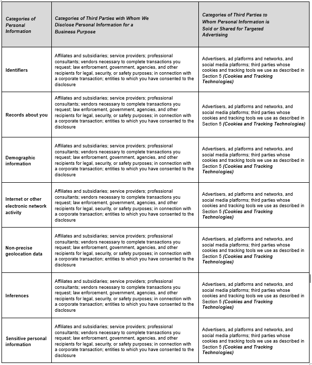 Although we have not “sold” Personal Information for money in the past 12 months, we engage in routine practices with our website and other online properties involving third parties that could be considered a sale or sharing for targeted advertising, as those terms are defined under applicable laws. We do not knowingly sell or share for targeted advertising any Personal Information of minors under the age of 16 years old.